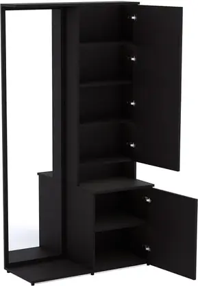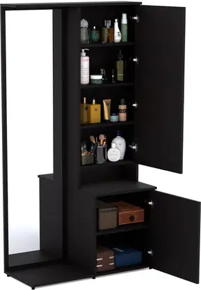 The design features a tall, distortion-free mirror for a perfect reflection, paired with a vertical 4-tier storage layout. These open shelves allow you to showcase your favorite beauty products while keeping them organized. Its compact and slim profile makes it an ideal choice for space-saving needs in apartments or smaller bedrooms. With its easy-to-clean surface and termite-resistant properties, this dressing table is a long-lasting addition to your home.
